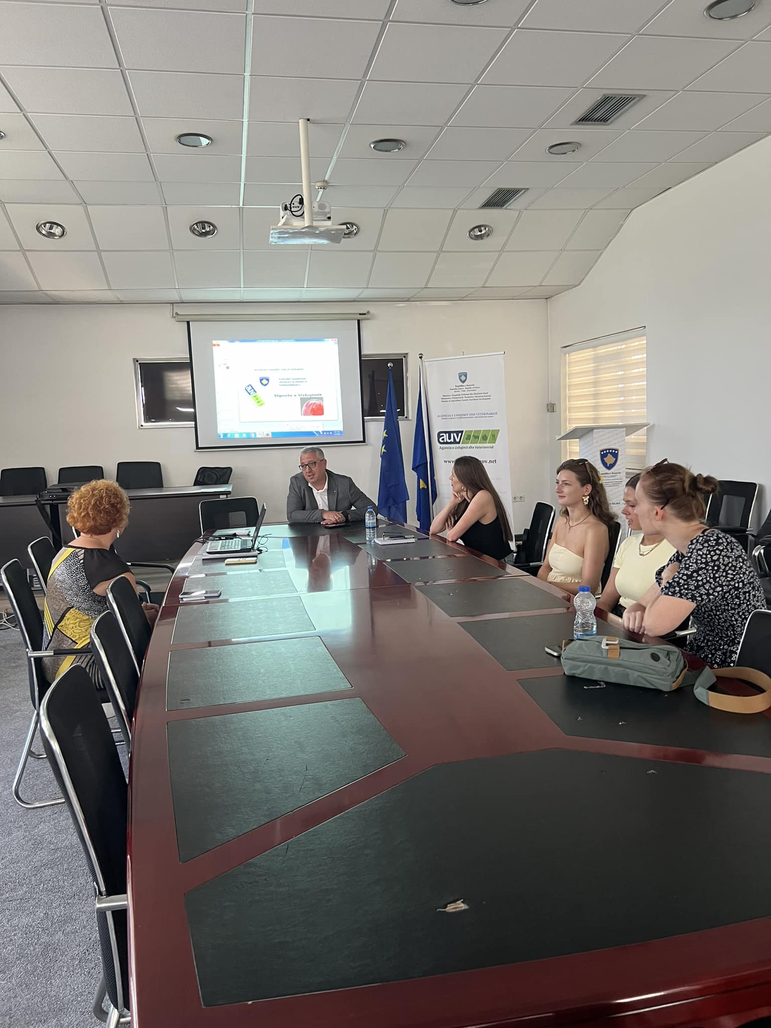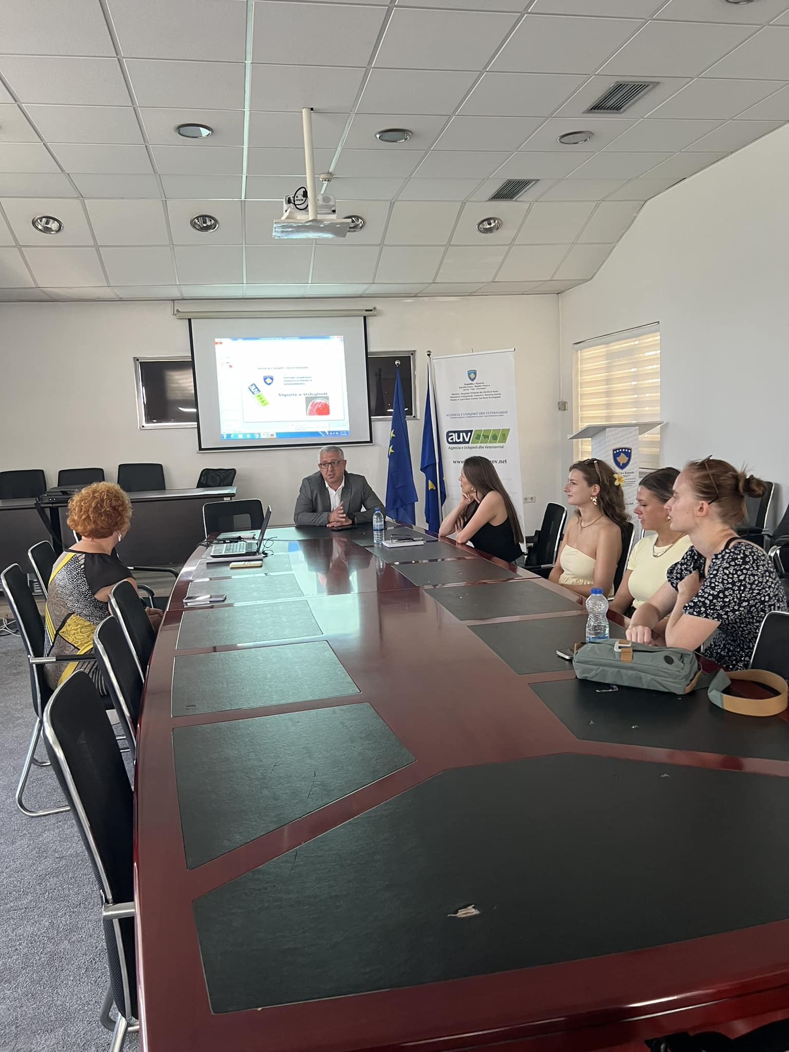 Sot në Agjencinë e Ushqimit dhe Veterinarisë, u pritën në takim studentet ndërkombëtare të universitetit verorë të Universitetit të Prishtinës, fakultetit të Teknologjisë Ushqimore, të lëndës ‘’ Një shëndet’’ të udhëhequr nga profesoreshat: Arbenita Hasani dhe Kaltrina Berisha. Në pritjen e mirëseardhjes Drejtori Ekzekutiv i AUV-së z. Bekim Hoxha, duke i falënderuar për vizitën u shpreh se: Autoriteti qe unë drejtojë gjithmonë do ti ketë dyert e hapura për rininë, studentët qe zgjedhin të studiojnë në fushat e shkencave të ushqimit veterinarisë dhe bujqësisë. Përveç mundësisë qe u japim për kryerje të punës praktike, në të gjitha drejtoritë dhe sektorët pa përjashtim. Jam duke u angazhuar qe bashkëpunimi të ngritët edhe ne nivele me të larta, duke qen partnerë në lidhjen e marrëveshjeve me universitete dhe institute shkencore jashtë vendit. Sot këtu i kemi student nga vende të Bashkimit Evropian, do të punoj fortë qe edhe studentet tonë të kenë mundësitë të vizitojnë dhe të jenë pjesë e programeve hulumtuese në shtete tjera.